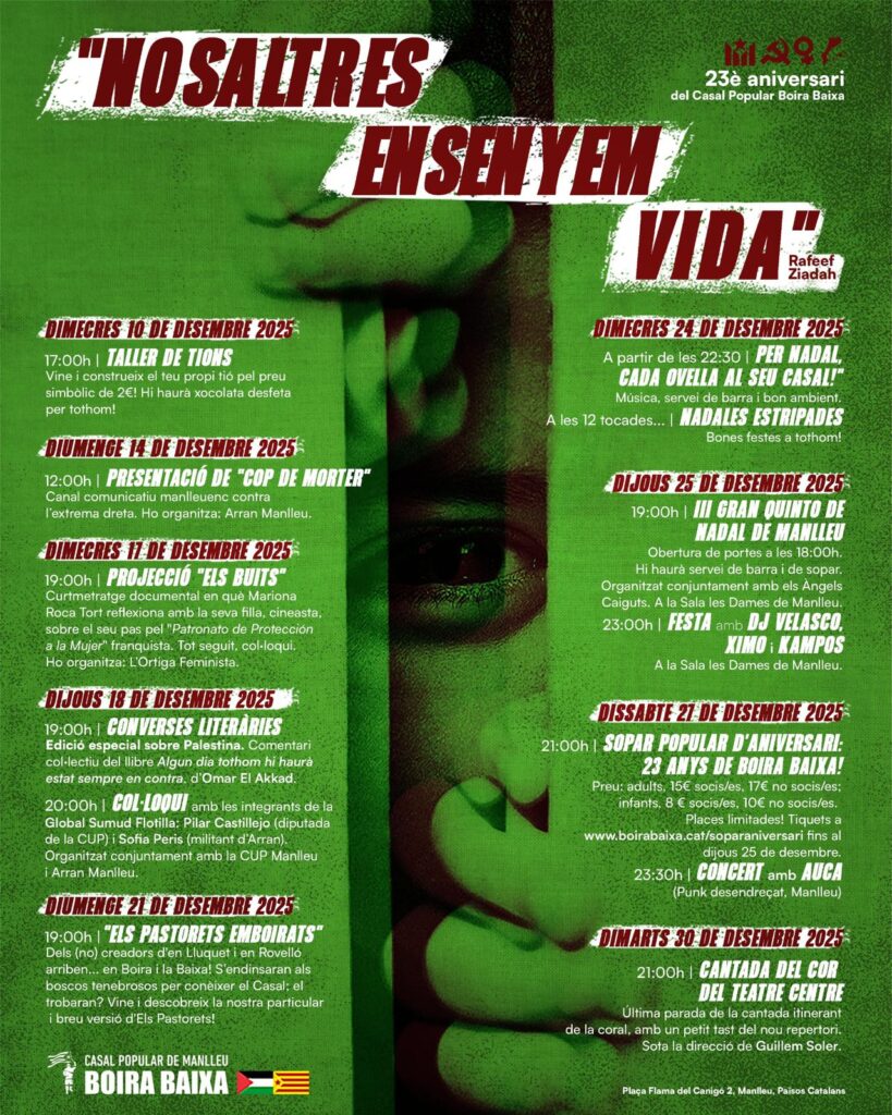 Aquest desembre farà vint-i-tres anys del naixement del Casal Popular Boira Baixa i, com és tradicional, hem preparat nombrosos actes per celebrar-ho al llarg del mes de desembre de 2025. El lema escollit per commemorar l’aniversari d’enguany és “Nosaltres ensenyem vida”, una cita de la poetessa d’ascendència palestina Rafeef Ziadah amb el qual volem refermar el nostre suport a la lluita del poble palestí.