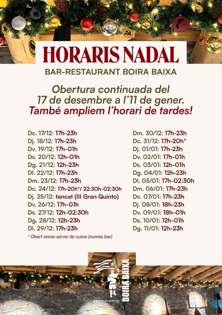🎄 Per Nadal, ampliem els horaris del bar-restaurant: obertura continuada de dimecres 17 de desembre a diumenge 11 de gener i avançament d’una hora de l’obertura a les tardes (17h). ⏰🗓️