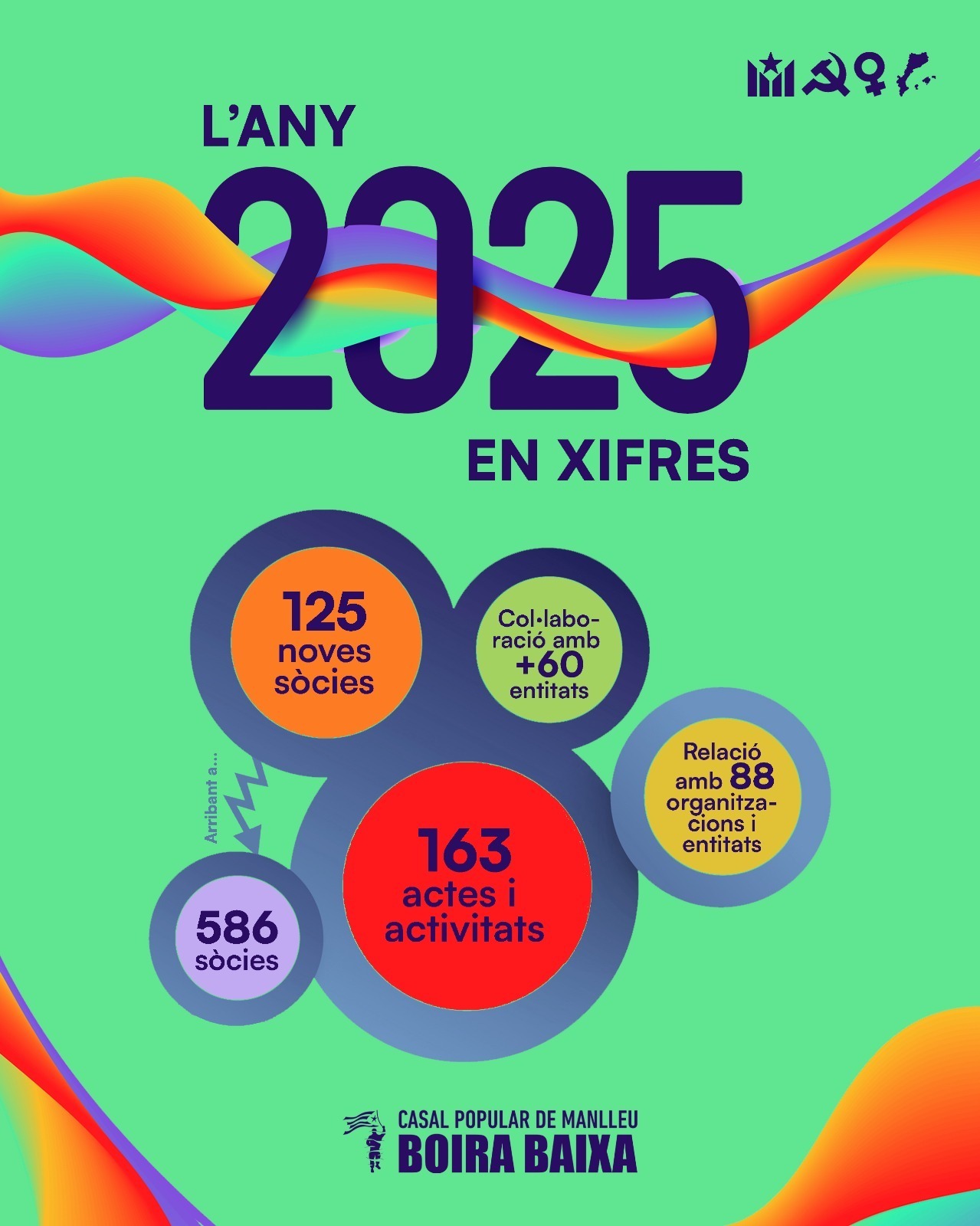 ✨ I fins aquí el 2025. Fem balanç del primer any complet amb el nou Boira Baixa en funcionament: 163 actes i activitats; 125 noves sòcies (arribant a 586); col·laboracions amb 60 entitats i organitzacions i vincles amb 88.