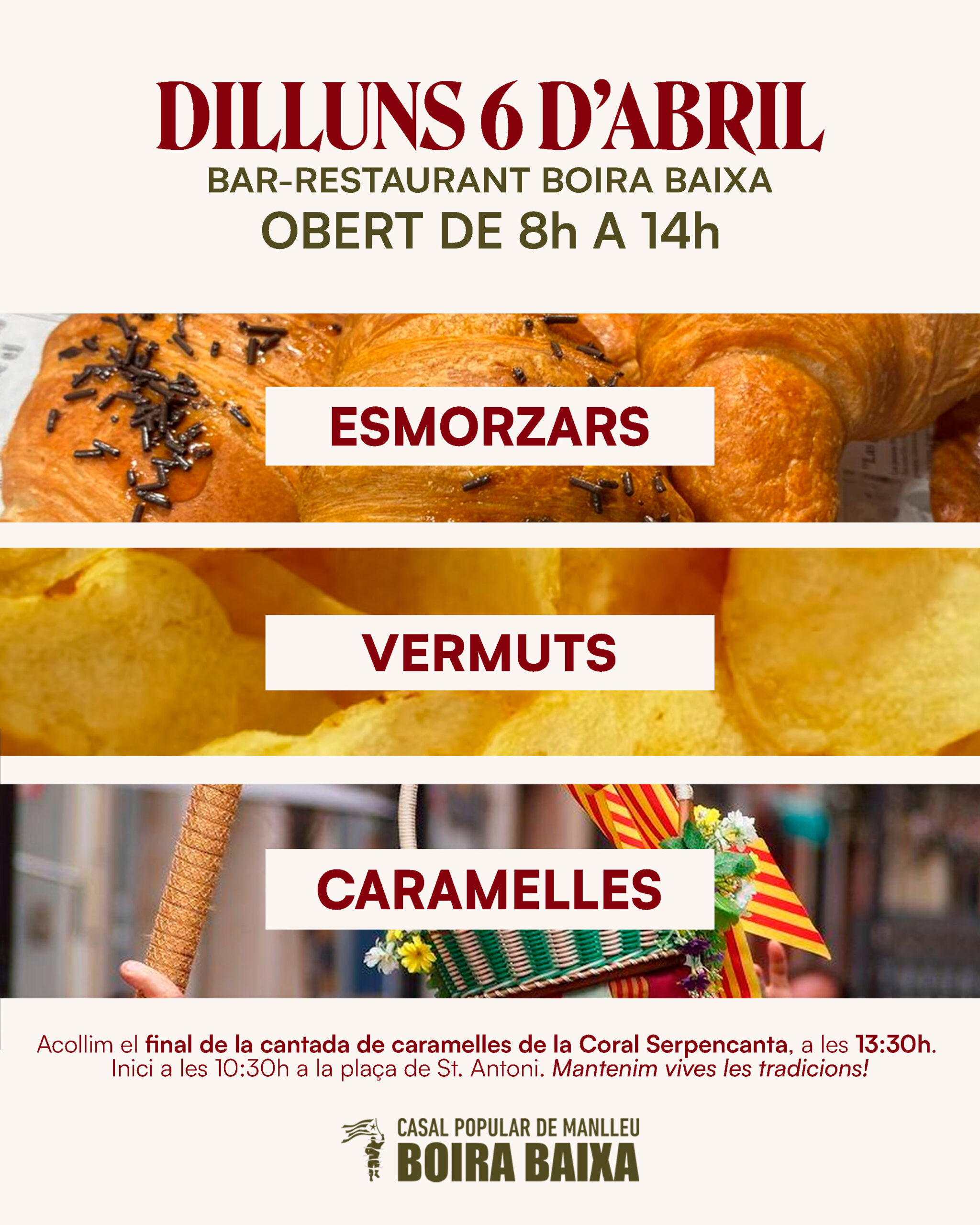 Acollim la parada final de la cantada de caramelles impulsada per la Coral Serpencanta, que començarà a 2/4 d’11 del matí a la pl. St. Antoni i acabarà al Boira Baixa a 2/4 de 2del migdia. Mantenim vives les tradicions!
