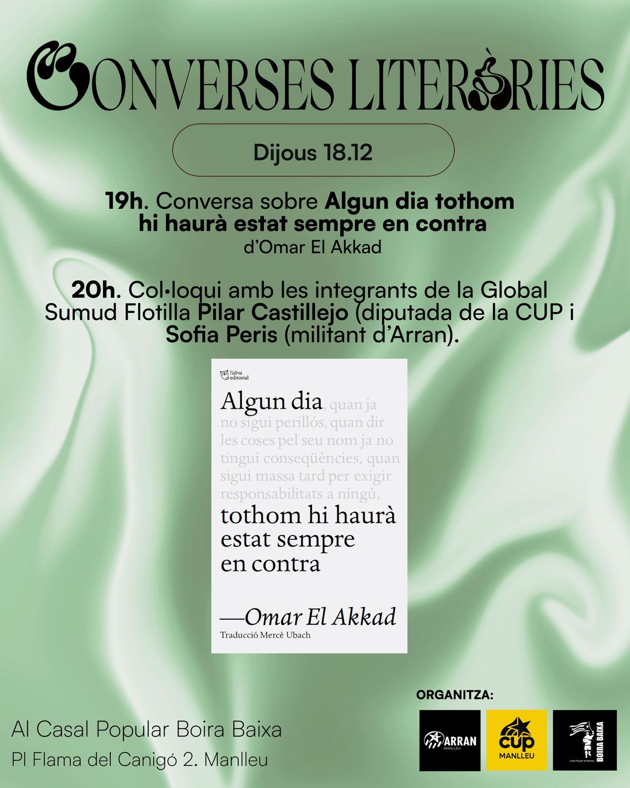 Casal Popular Boira Baixa Plaça Flama del Canigó, 2, Manlleu, Països CatalansEdició especial de les converses literàries Boira Baixa sobre Palestina. Comentari col·lectiu del llibre Algun dia tothom hi haurà estat sempre en contra, d'Omar El Akkad. "Una crònica punyent i incomòda que clama contra el silenci eixordador dels mitjans de comunicació i que denuncia la incapacitat i les trampes del llenguatge a l’hora de descriure […]