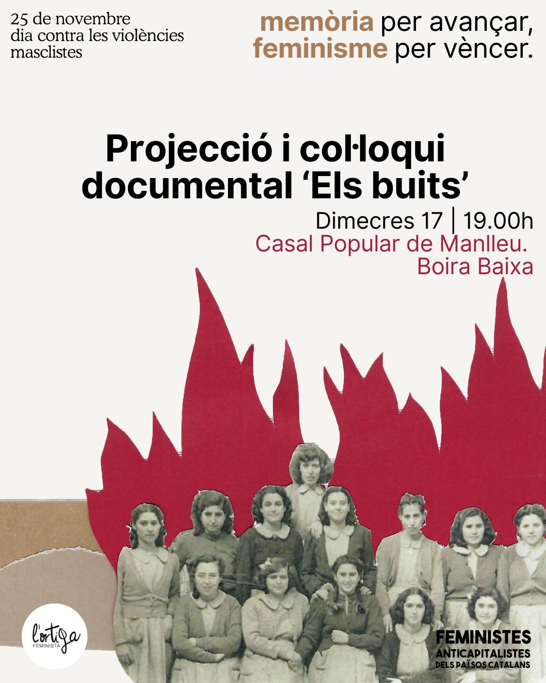 Projecció del curtmetratge documental Els buits, en què Mariona Roca Tort reflexiona amb la seva filla, cineasta, sobre el seu pas pel "Patronato de Protección a la Mujer" franquista. Tot seguit, col·loqui.