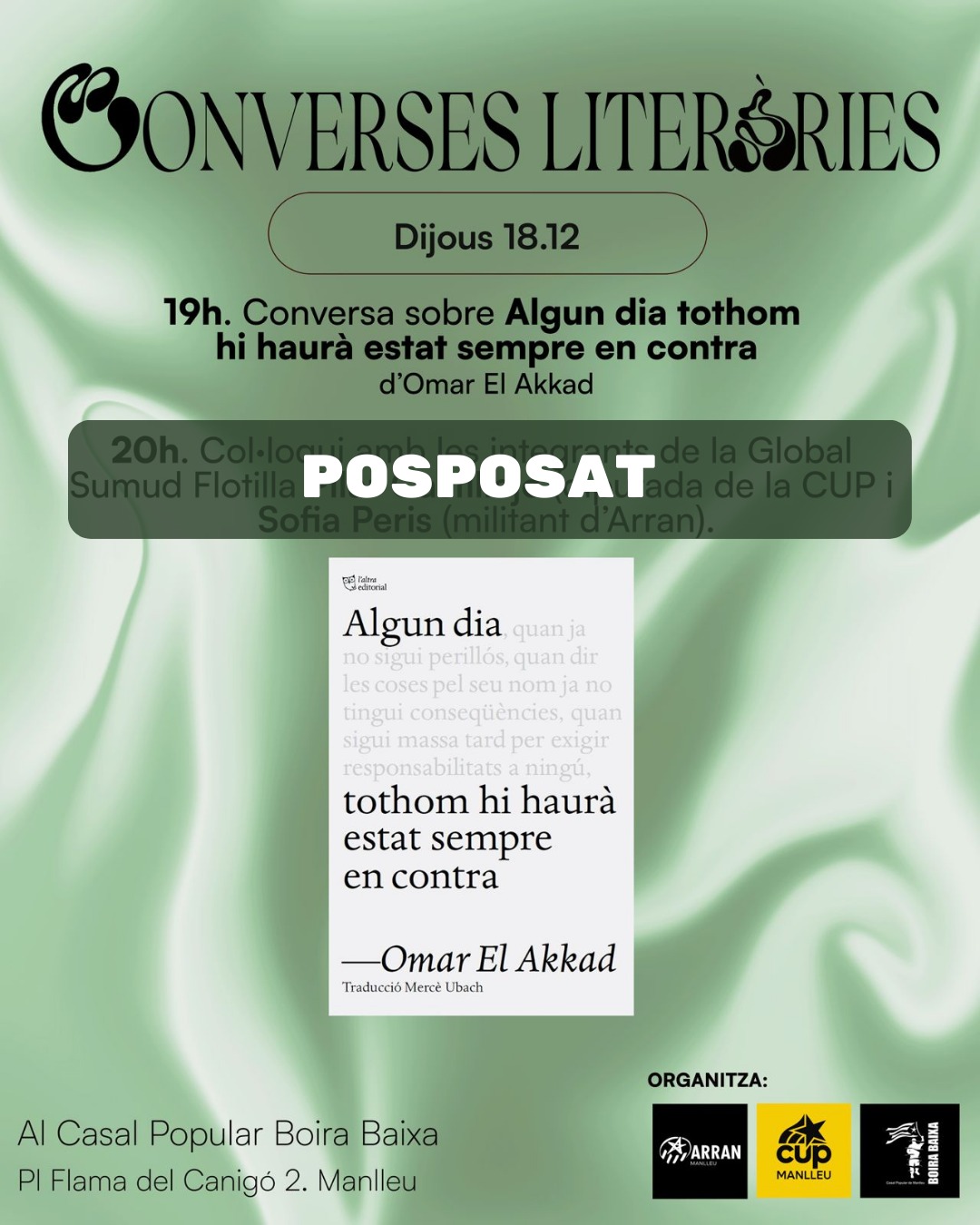 Casal Popular Boira Baixa Plaça Flama del Canigó, 2, Manlleu, Països CatalansEdició especial de les converses literàries Boira Baixa sobre Palestina. Comentari col·lectiu del llibre Algun dia tothom hi haurà estat sempre en contra, d'Omar El Akkad. "Una crònica punyent i […]
